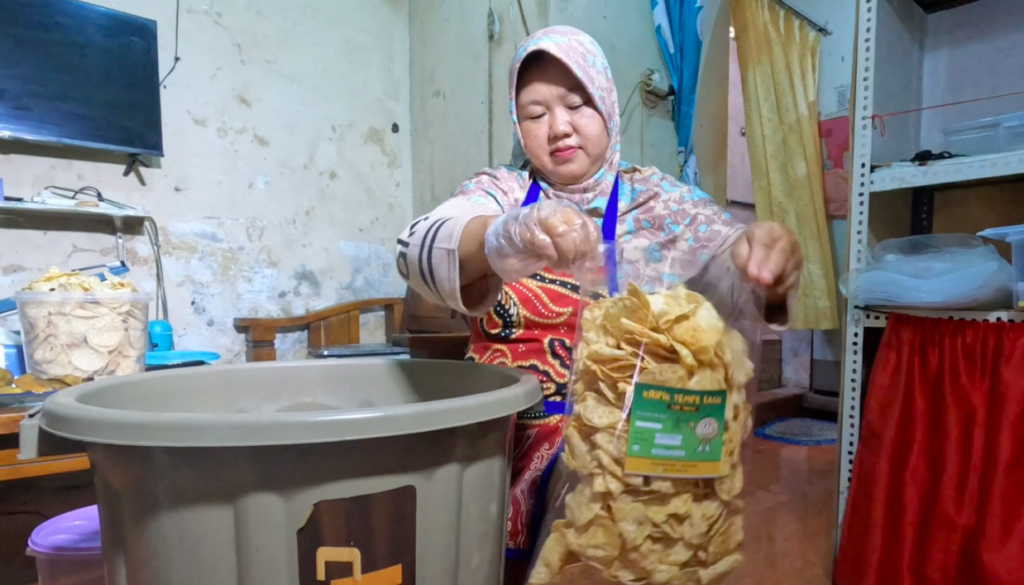 “Karena saya memiliki usaha tempe, saya punya ide untuk membuat keripik tempe sagu bersama teman-teman saya yang di kampung,” ujar Bu Nurul.